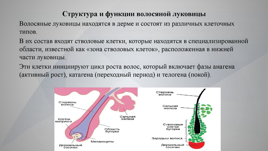 Структура и функции волосяной луковицыВолосяные луковицы находятся в дерме и состоят из различных клеточных