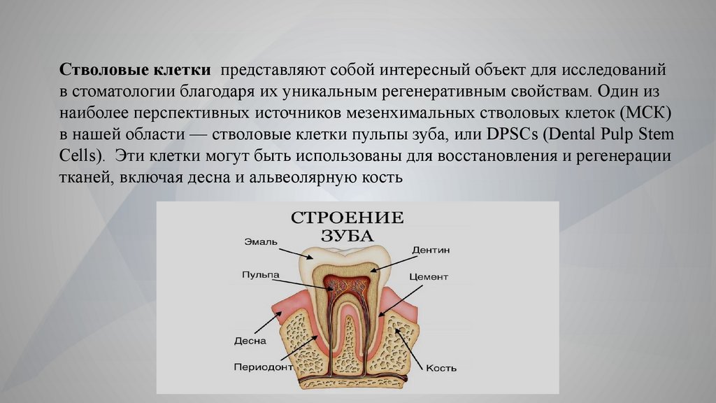в нашей области — стволовые клетки пульпы зуба, или DPSCs (Dental Pulp Stem