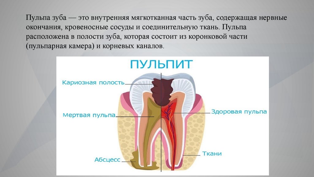 Пульпа зуба — это внутренняя мягкотканная часть зуба, содержащая нервныеокончания, кровеносные сосуды и соединительную ткань. Пульпа