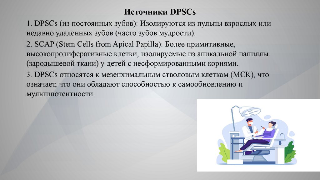 Источники DPSCs1. DPSCs (из постоянных зубов): Изолируются из пульпы взрослых или