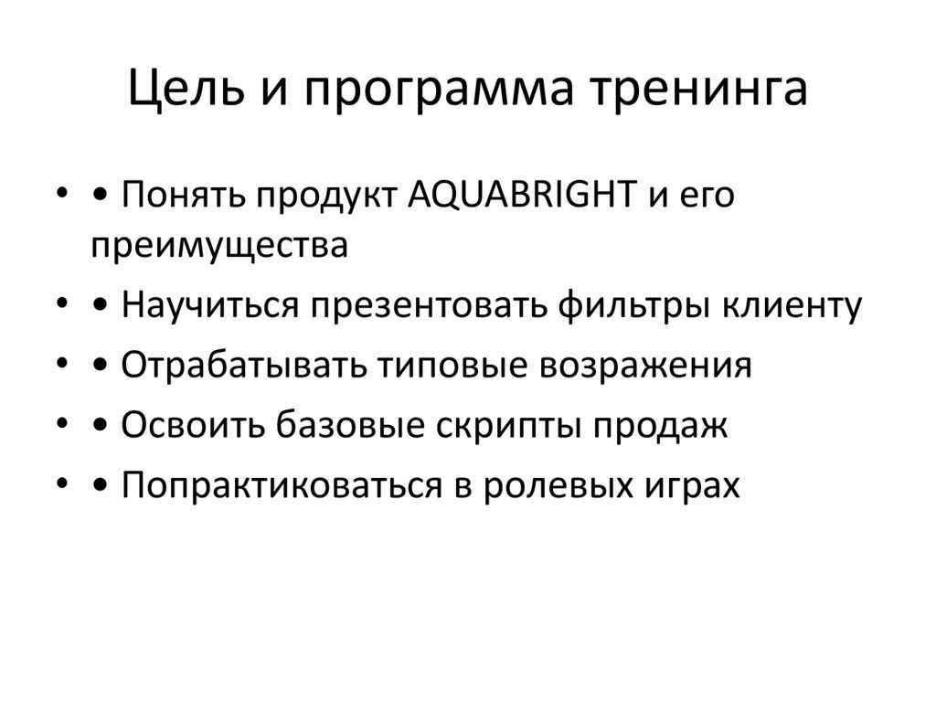 Цель и программа тренинга• • Понять продукт AQUABRIGHT и его