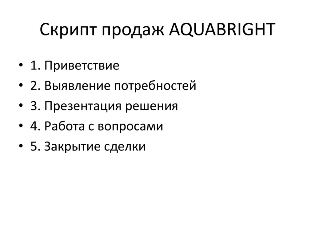 Скрипт продаж AQUABRIGHT• 1. Приветствие