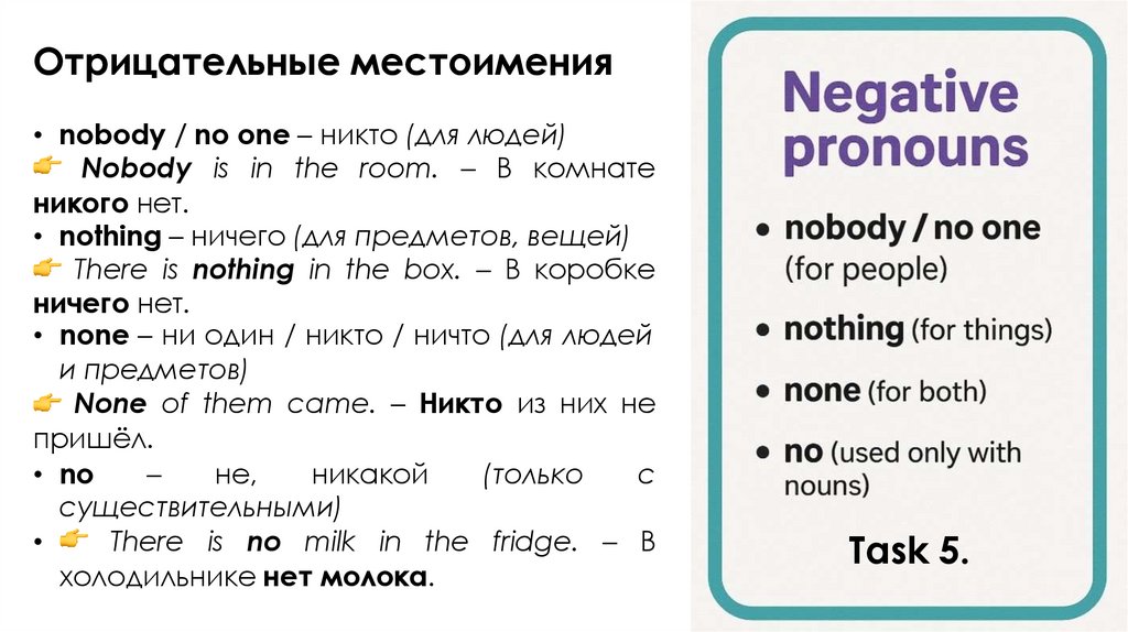 Отрицательные местоимения• nobody / no one – никто (для людей)