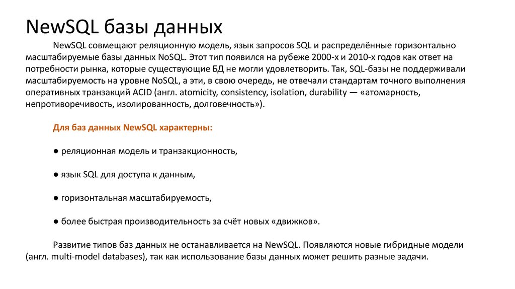 NewSQL базы данныхNewSQL совмещают реляционную модель, язык запросов SQL и распределённые горизонтально
