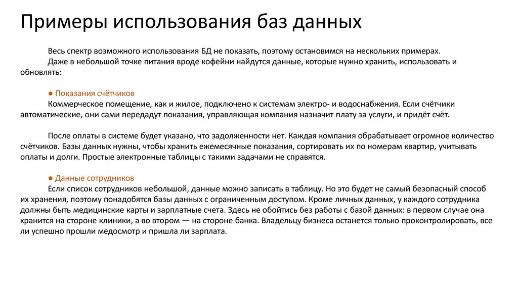 Примеры использования баз данныхВесь спектр возможного использования БД не показать, поэтому остановимся на нескольких примерах.