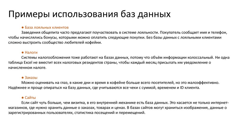 Примеры использования баз данных● База лояльных клиентов
