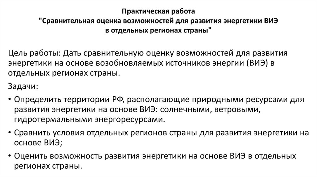 Цель работы: Дать сравнительную оценку возможностей для развитияэнергетики на основе возобновляемых источников энергии (ВИЭ) в