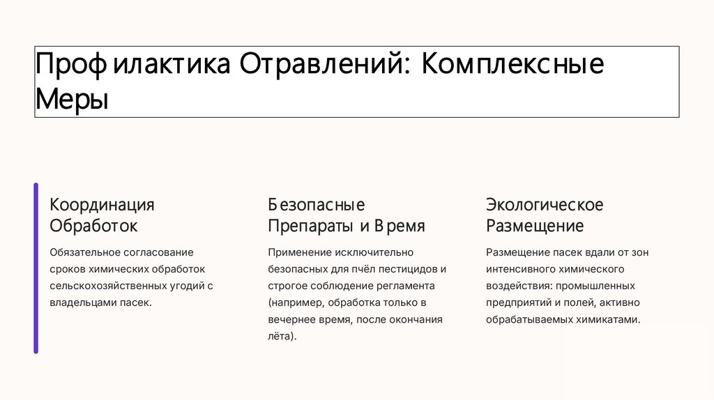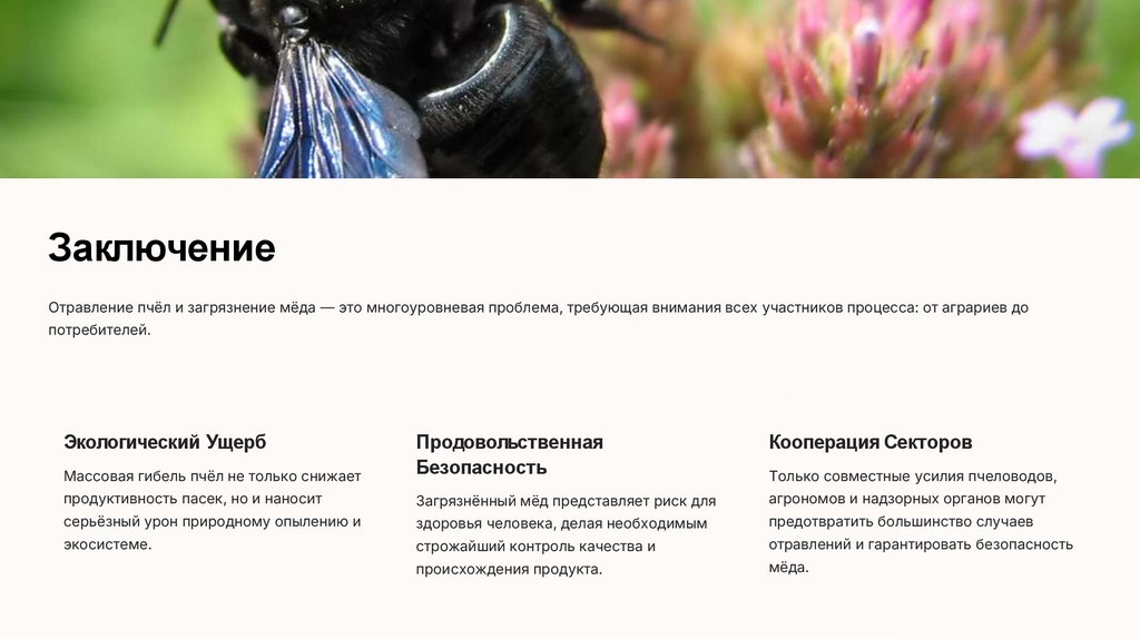 ЗаключениеОтравление пчёл и загрязнение мёда — это многоуровневая проблема, требующая внимания всех участников процесса: от аграриев до