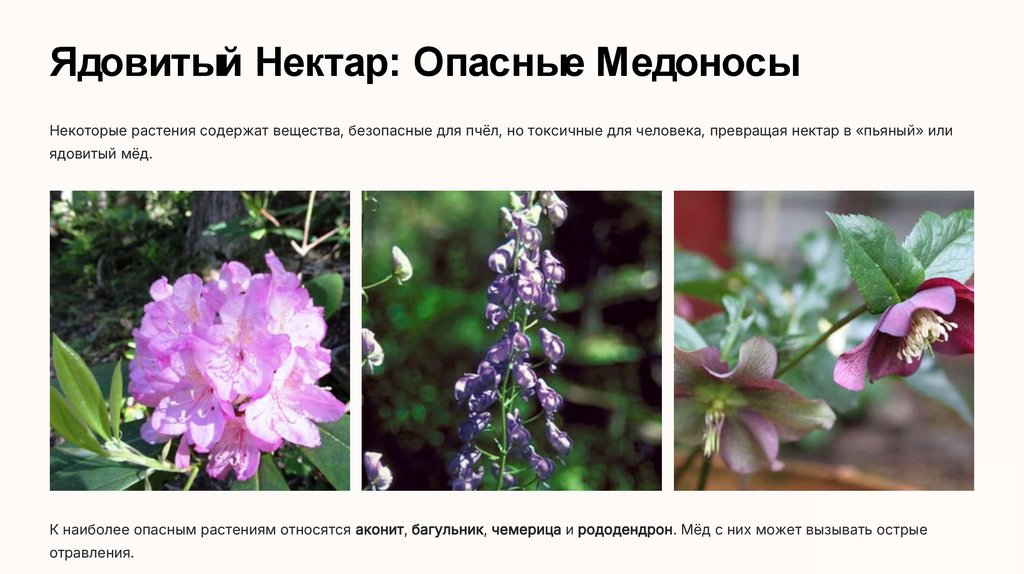 Ядовитый Нектар: Опасные МедоносыНекоторые растения содержат вещества, безопасные для пчёл, но токсичные для человека, превращая нектар в «пьяный» или