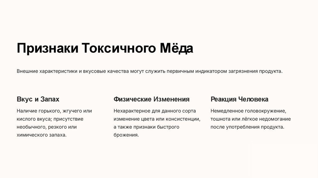 Признаки Токсичного МёдаВнешние характеристики и вкусовые качества могут служить первичным индикатором загрязнения продукта.