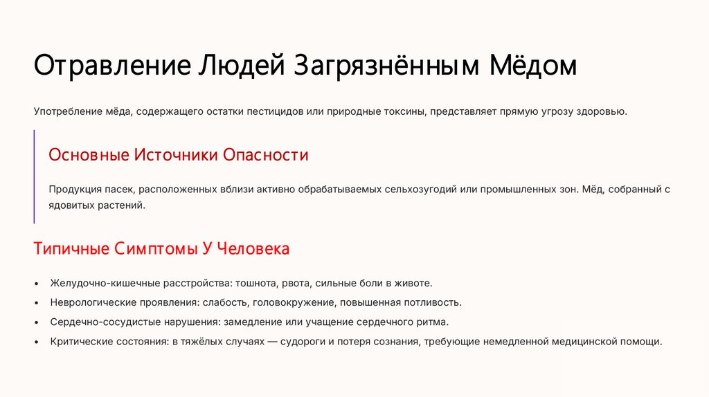 Отравление Людей Загрязнённым МёдомУпотребление мёда, содержащего остатки пестицидов или природные токсины, представляет прямую угрозу здоровью.