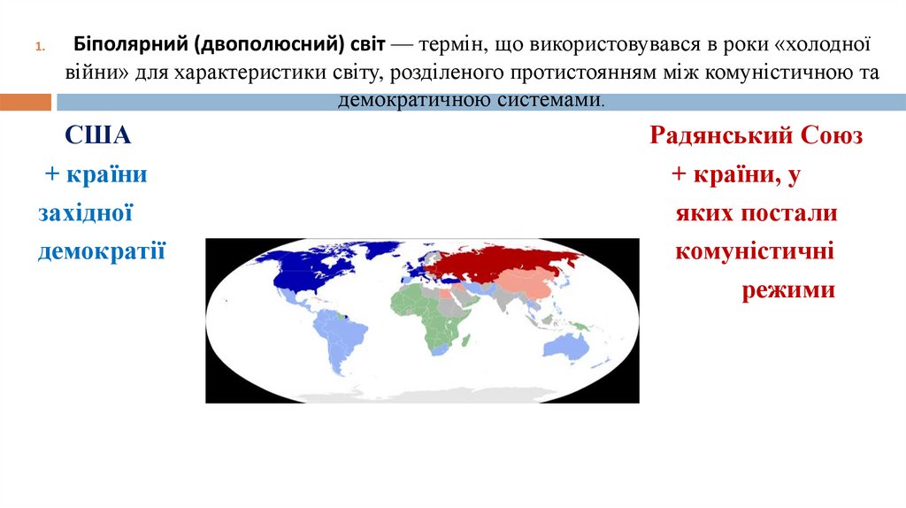 1.Біполярний (двополюсний) світ — термін, що використовувався в роки «холодної