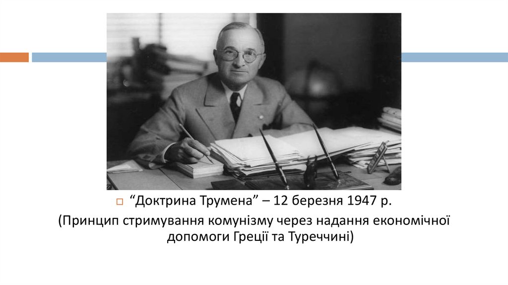 “Доктрина Трумена” – 12 березня 1947 р.(Принцип стримування комунізму через надання економічної