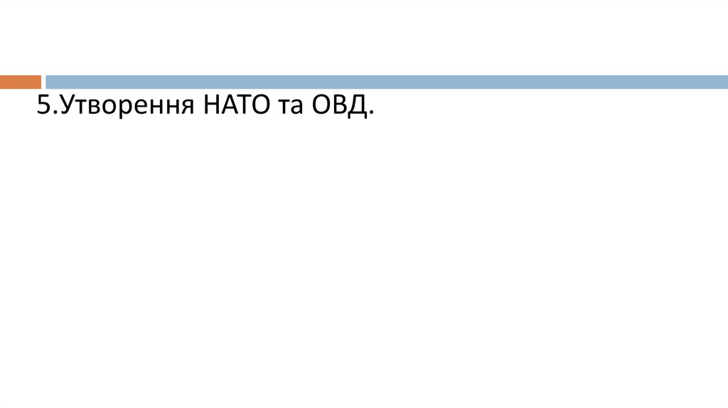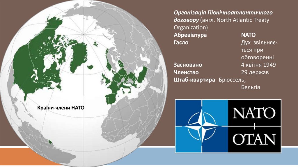 (NATO - North Atlantic Treaty Organization) – Північно-Атлантична договірнаорганізація. Була створена 4 квітня 1949р. Спочатку сюди ввійшли 12