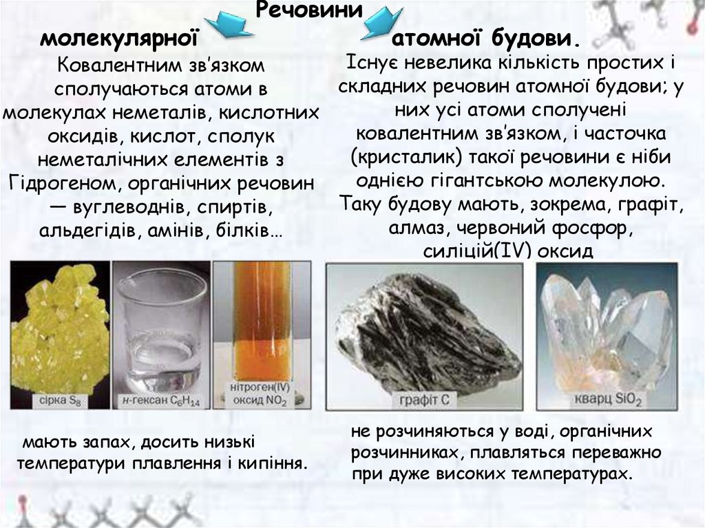 в сполуках: H O, HCl, NH , CH , CO , SO2, P O , N O .