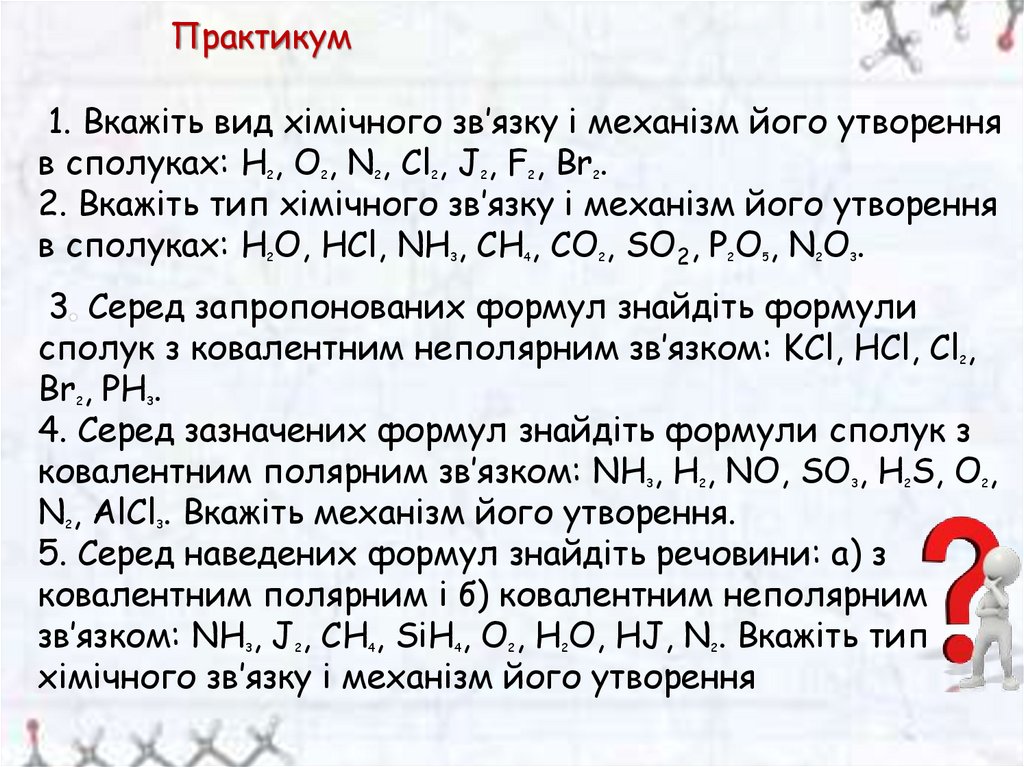 Практикум1. Вкажіть вид хімічного зв’язку і механізм його утворення