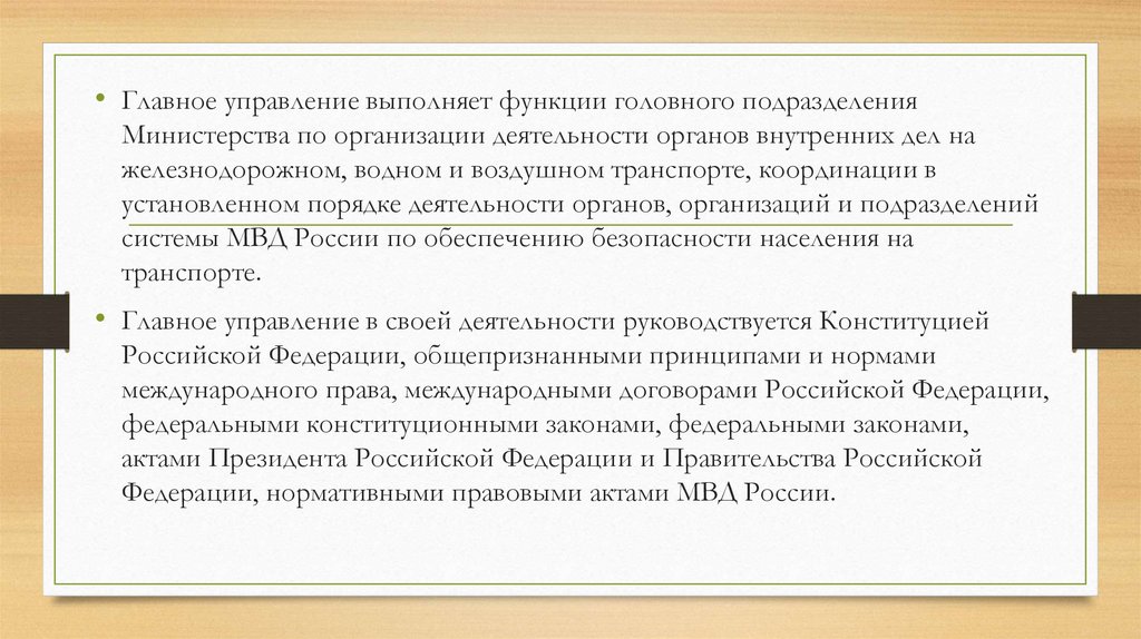 • Главное управление выполняет функции головного подразделенияМинистерства по организации деятельности органов внутренних дел на