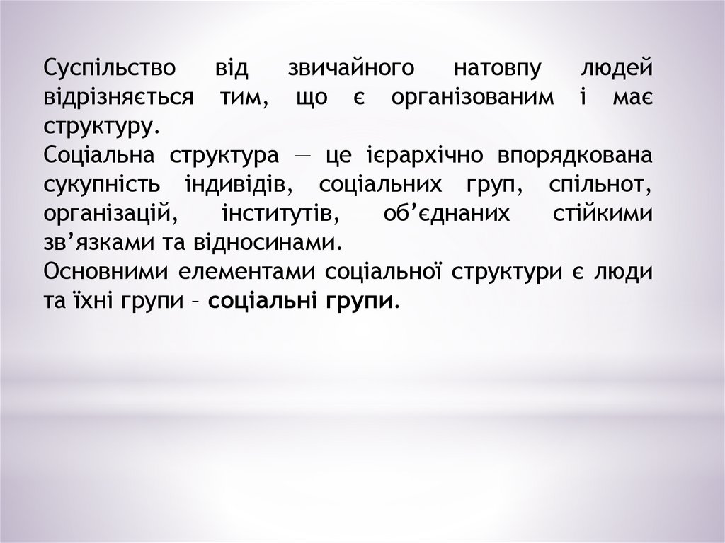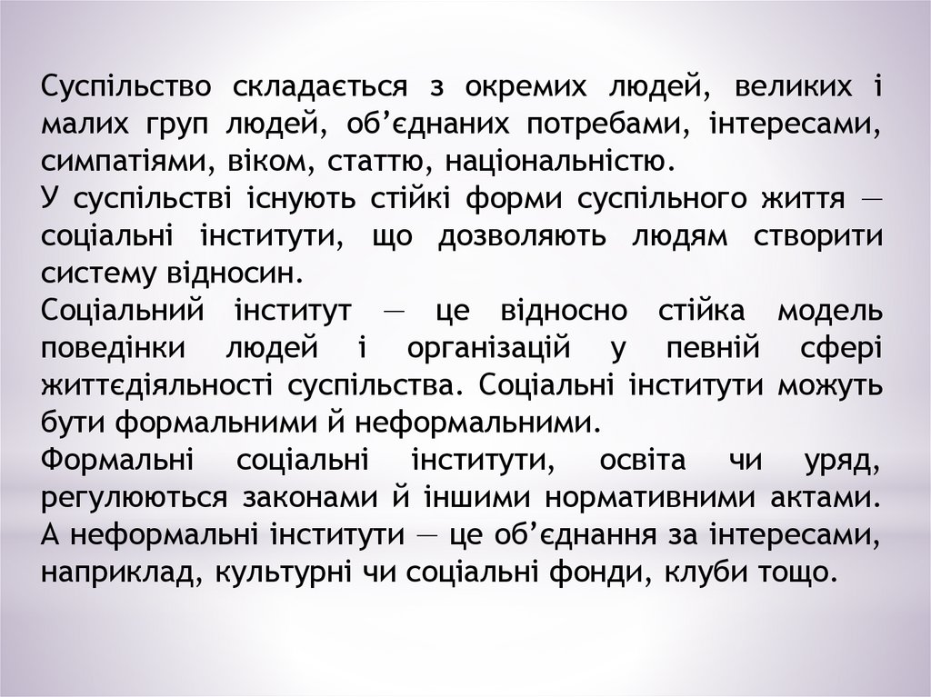 Суспільство складається з окремих людей, великих імалих груп людей, об’єднаних потребами, інтересами,