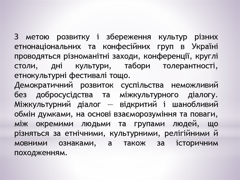 З метою розвитку і збереження культур різнихетнонаціональних та конфесійних груп в Україні