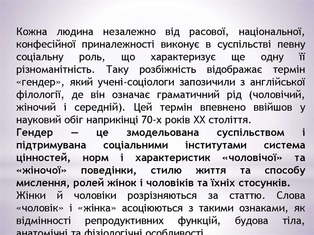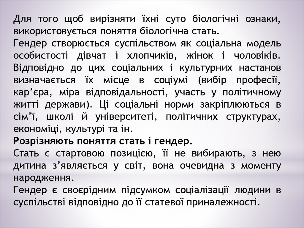 Для того щоб вирізняти їхні суто біологічні ознаки,використовується поняття біологічна стать.