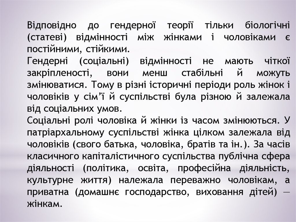 Відповідно до гендерної теорії тільки біологічні(статеві) відмінності між жінками і чоловіками є