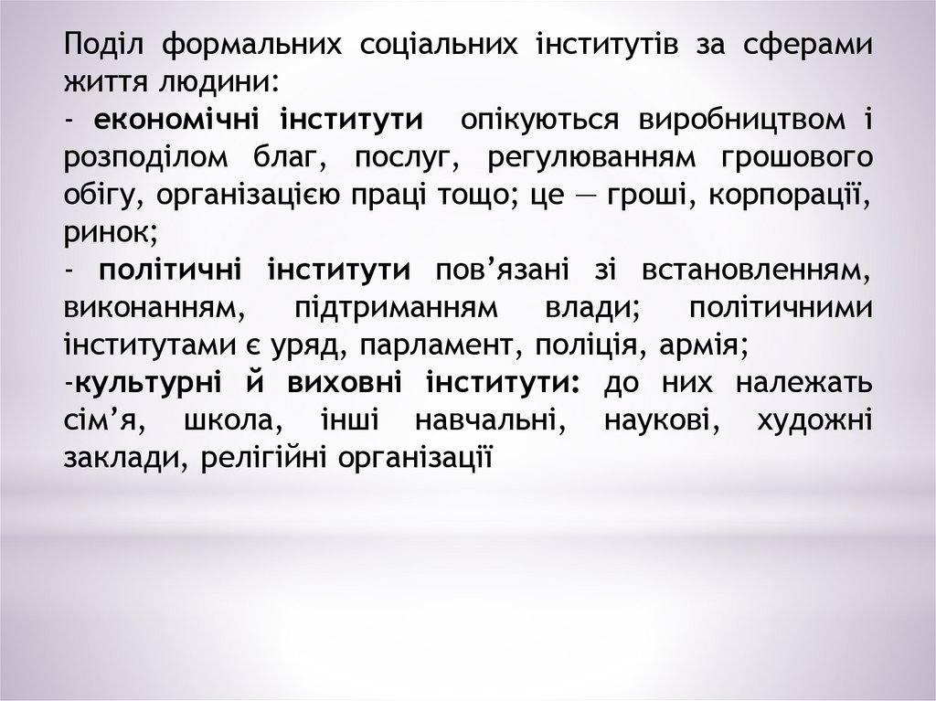 Поділ формальних соціальних інститутів за сферамижиття людини: