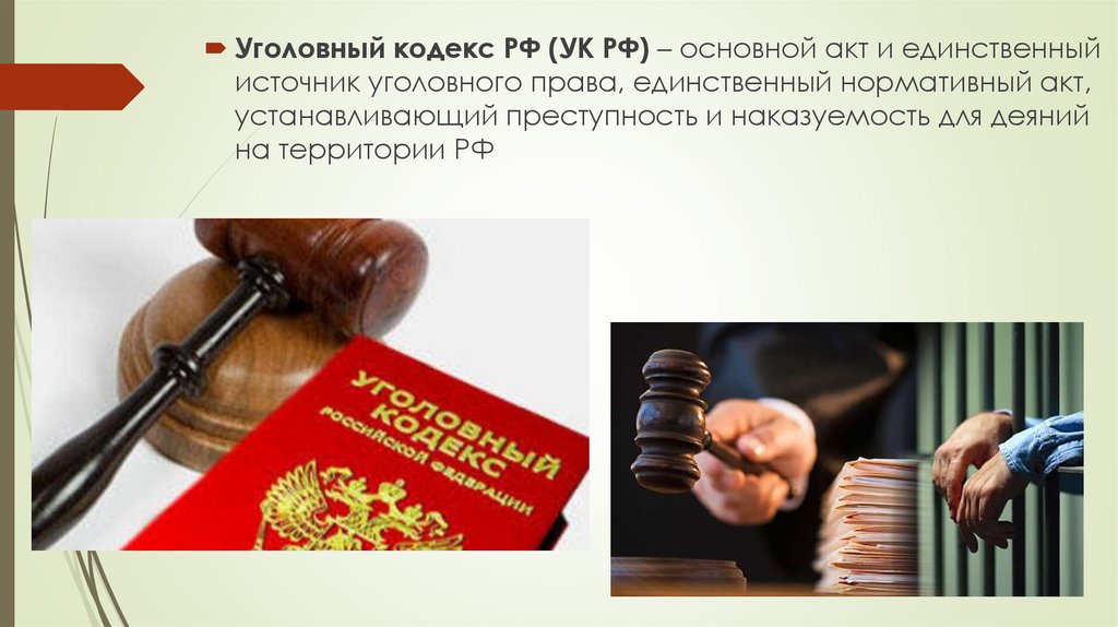 Уголовный кодекс РФ (УК РФ) – основной акт и единственныйисточник уголовного права, единственный нормативный акт,