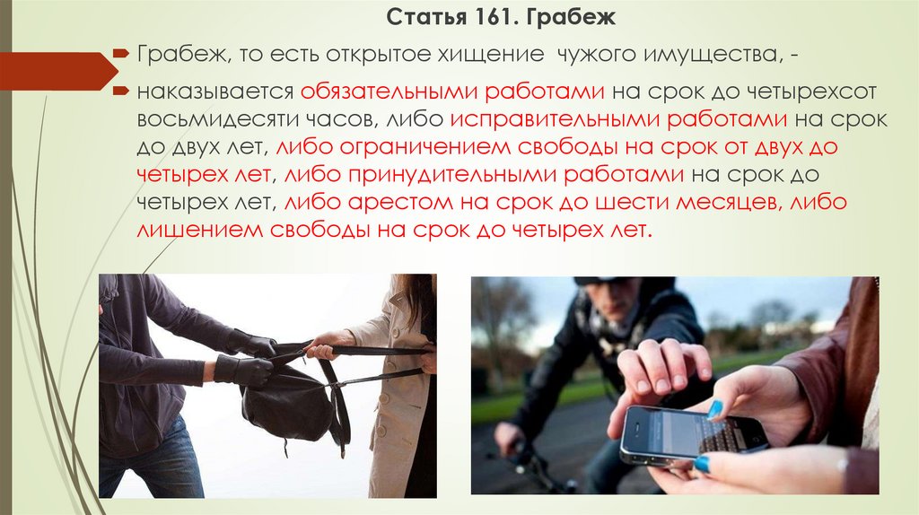 Статья 161. ГрабежГрабеж, то есть открытое хищение чужого имущества, наказывается обязательными работами на срок до четырехсот
