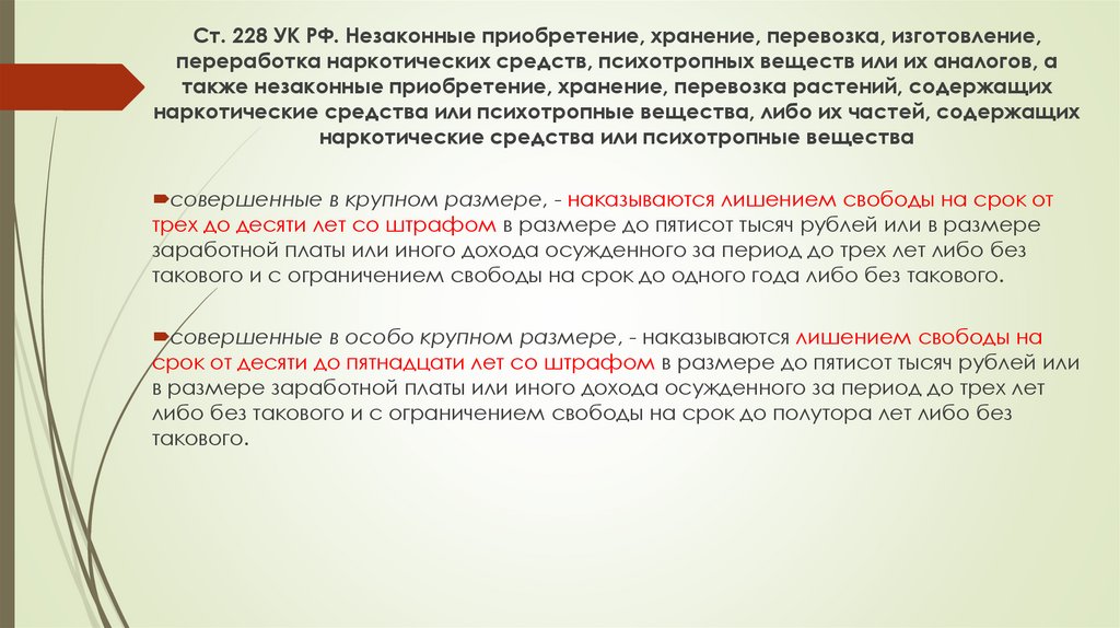 Ст. 228 УК РФ. Незаконные приобретение, хранение, перевозка, изготовление,переработка наркотических средств, психотропных веществ или их аналогов, а