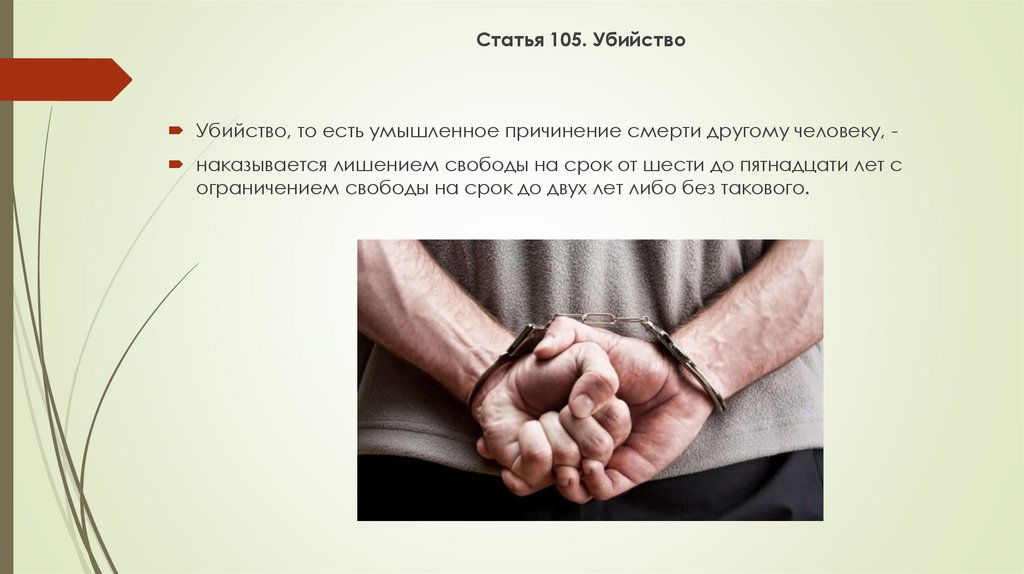 Статья 105. УбийствоУбийство, то есть умышленное причинение смерти другому человеку, наказывается лишением свободы на срок от шести до пятнадцати лет с
