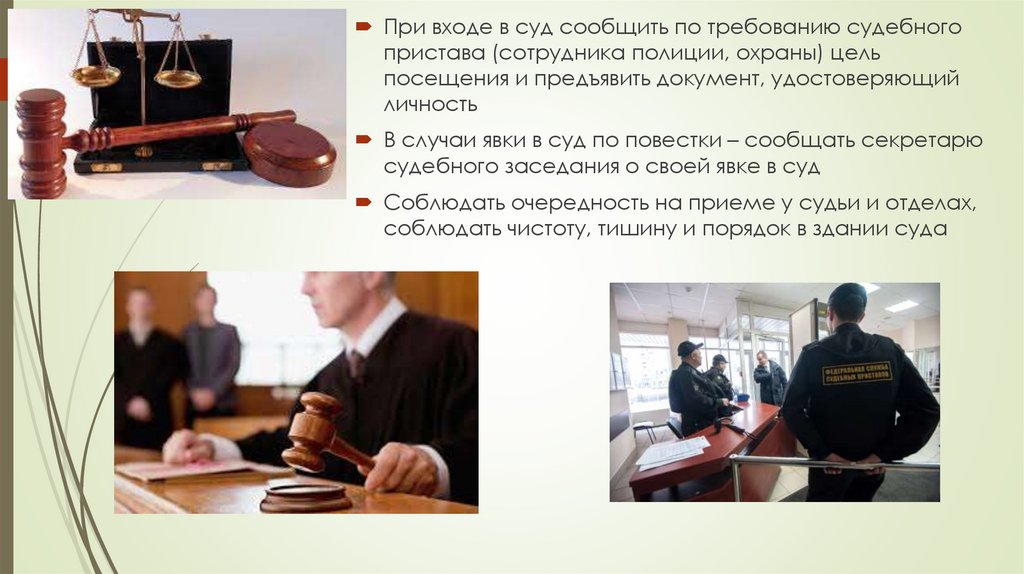 При входе в суд сообщить по требованию судебногопристава (сотрудника полиции, охраны) цель