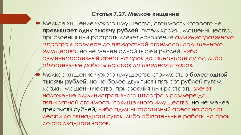 Статья 7.27. Мелкое хищениеМелкое хищение чужого имущества, стоимость которого не