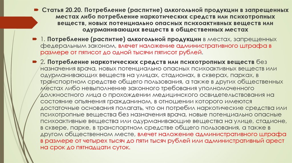 Статья 20.20. Потребление (распитие) алкогольной продукции в запрещенныхместах либо потребление наркотических средств или психотропных