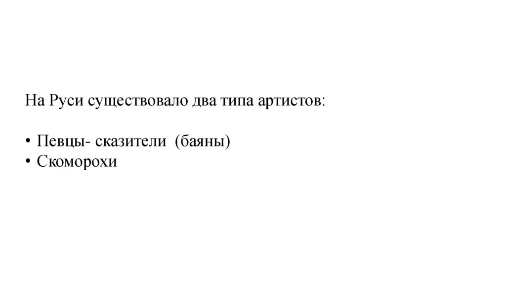 На Руси существовало два типа артистов:• Певцы- сказители (баяны)