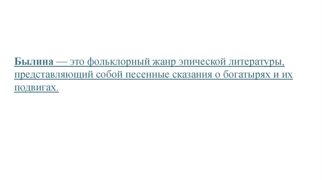 Былина — это фольклорный жанр эпической литературы,представляющий собой песенные сказания о богатырях и их