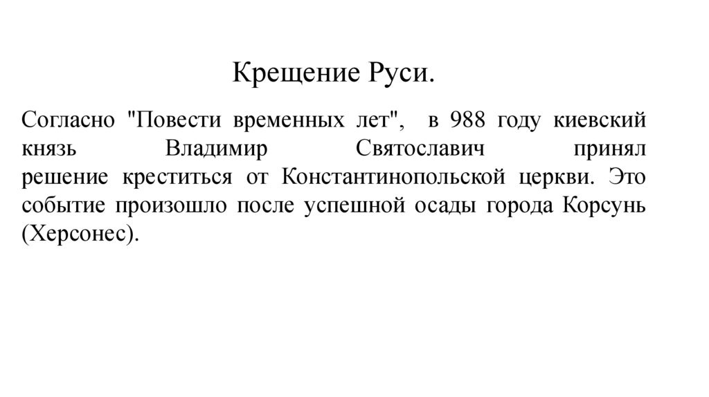 Крещение Руси.Согласно "Повести временных лет", в 988 году киевский