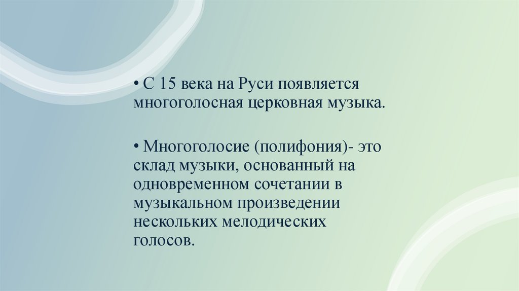 • С 15 века на Руси появляетсямногоголосная церковная музыка.