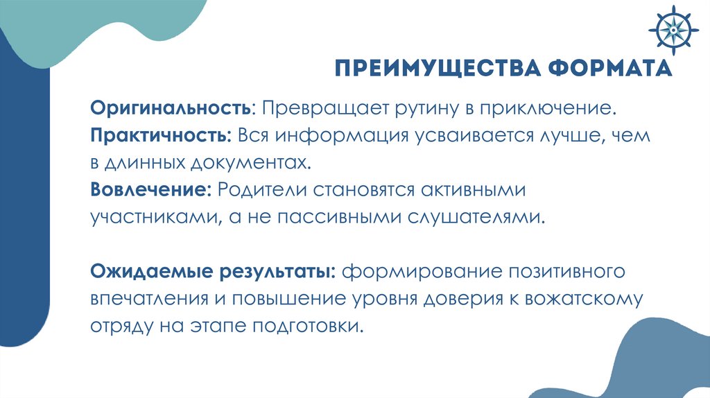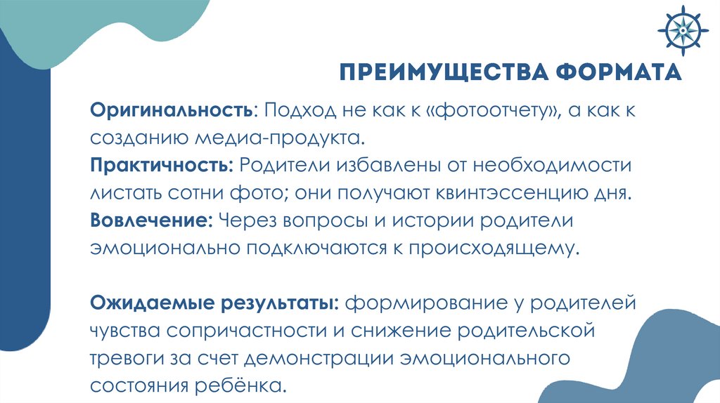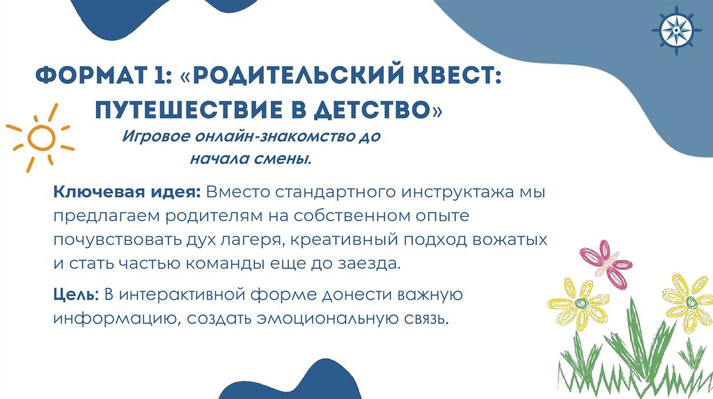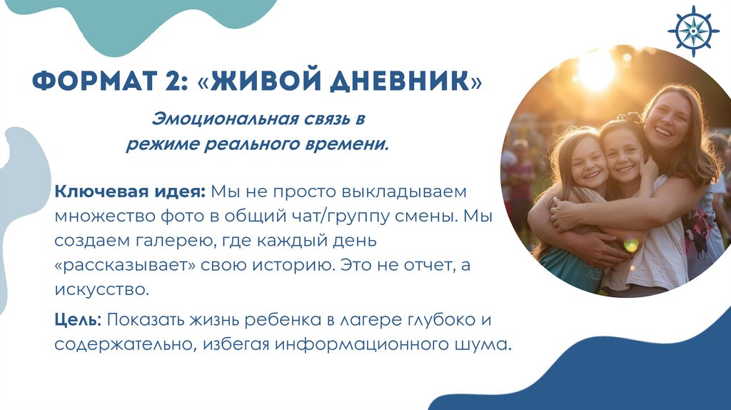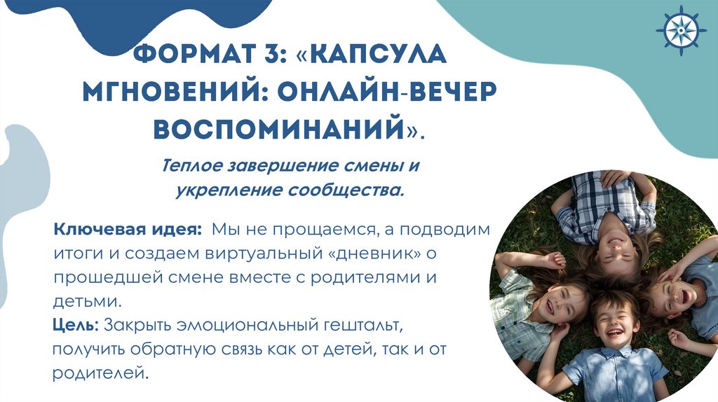 Целевая аудитория всех форматов: дети участники лагерной смены, их родителиУчастники всех форматов: дети, их