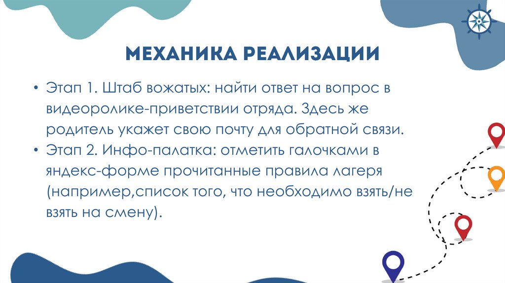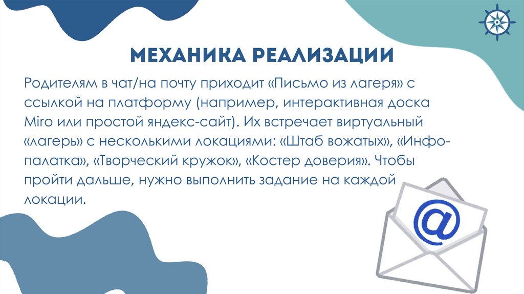 «лагерь» с несколькими локациями: «Штаб вожатых», «Инфопалатка», «Творческий кружок», «Костер доверия». Чтобы