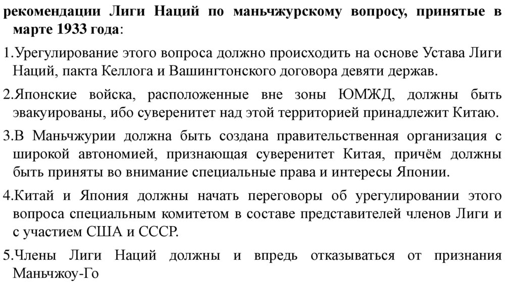 рекомендации Лиги Наций по маньчжурскому вопросу, принятые вмарте 1933 года: