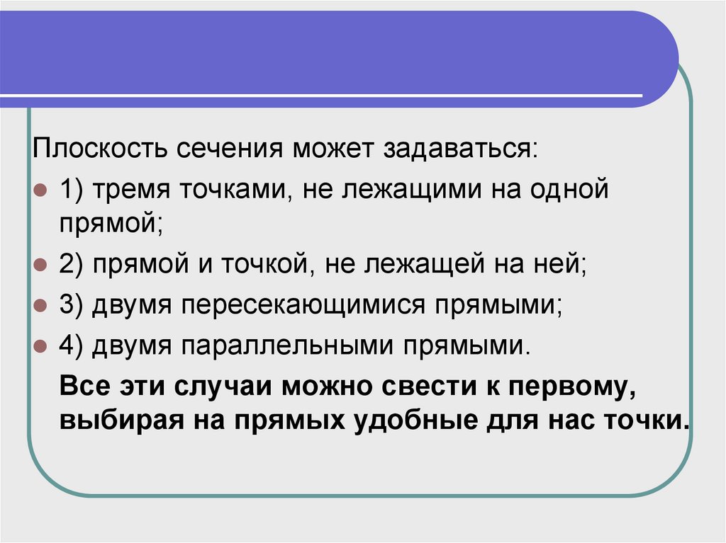 Плоскость сечения может задаваться:1) тремя точками, не лежащими на одной