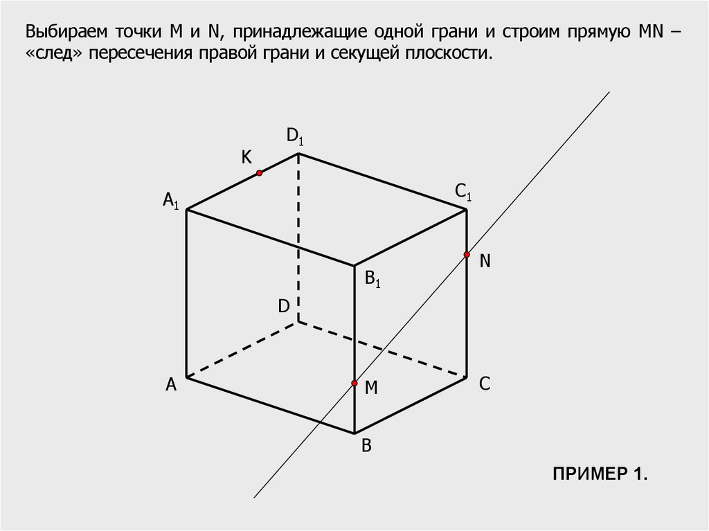Теперь обращаем внимание, что ребро куба В1С1 лежит в одной грани стретьей точкой сечения К (верхней) и в одной грани с появившейся прямой MN