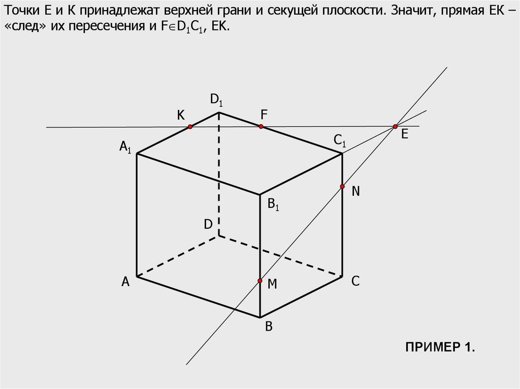 Точки Е и К принадлежат верхней грани и секущей плоскости. Значит, прямая ЕК –«след» их пересечения и F D1C1, EK.