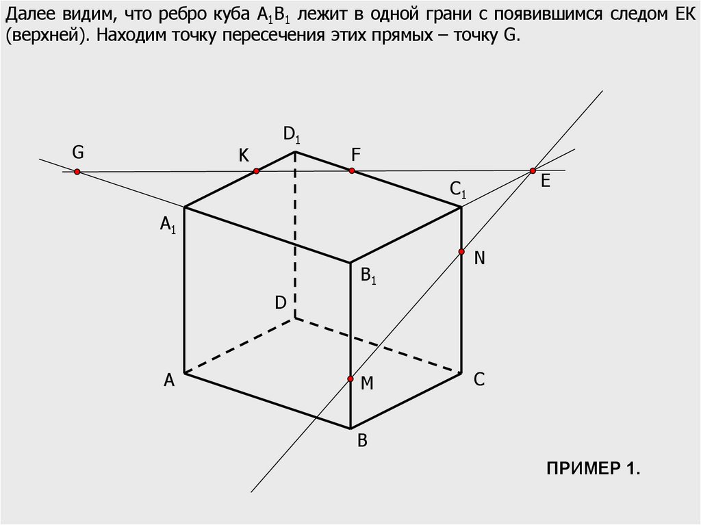 Далее видим, что ребро куба А1В1 лежит в одной грани с появившимся следом ЕК(верхней). Находим точку пересечения этих прямых – точку G.