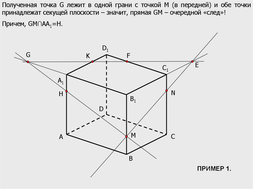Полученная точка G лежит в одной грани с точкой М (в передней) и обе точкипринадлежат секущей плоскости – значит, прямая GM – очередной «след»!