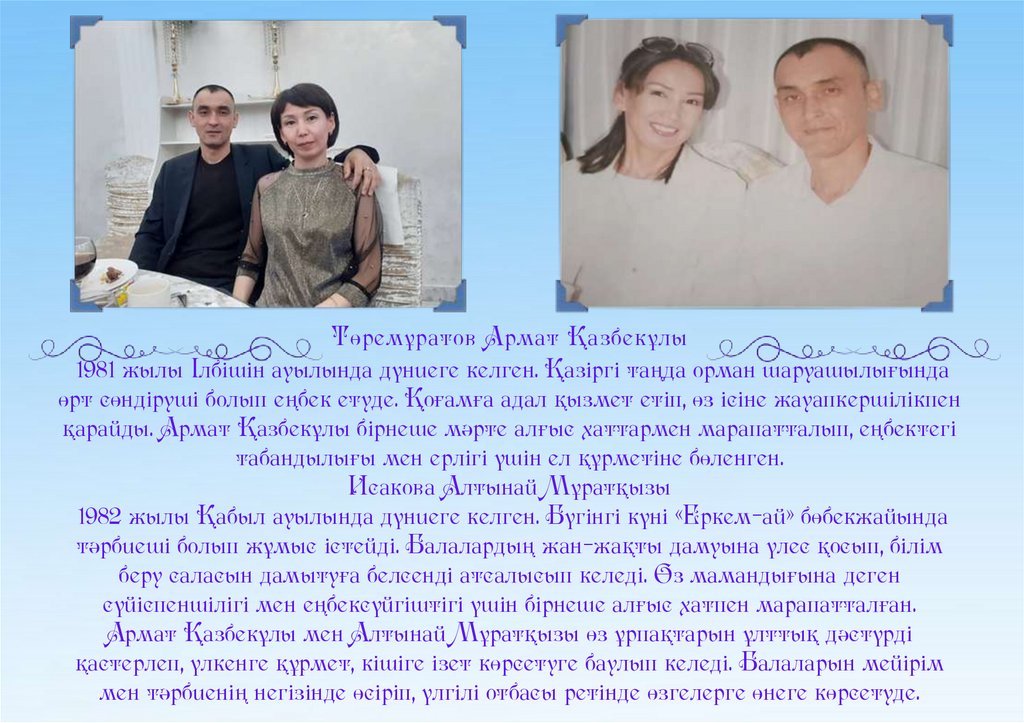 мен тәрбиенің негізінде өсіріп, үлгілі отбасы ретінде өзгелерге өнеге көрсетуде.