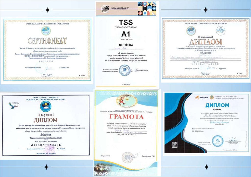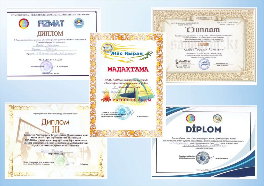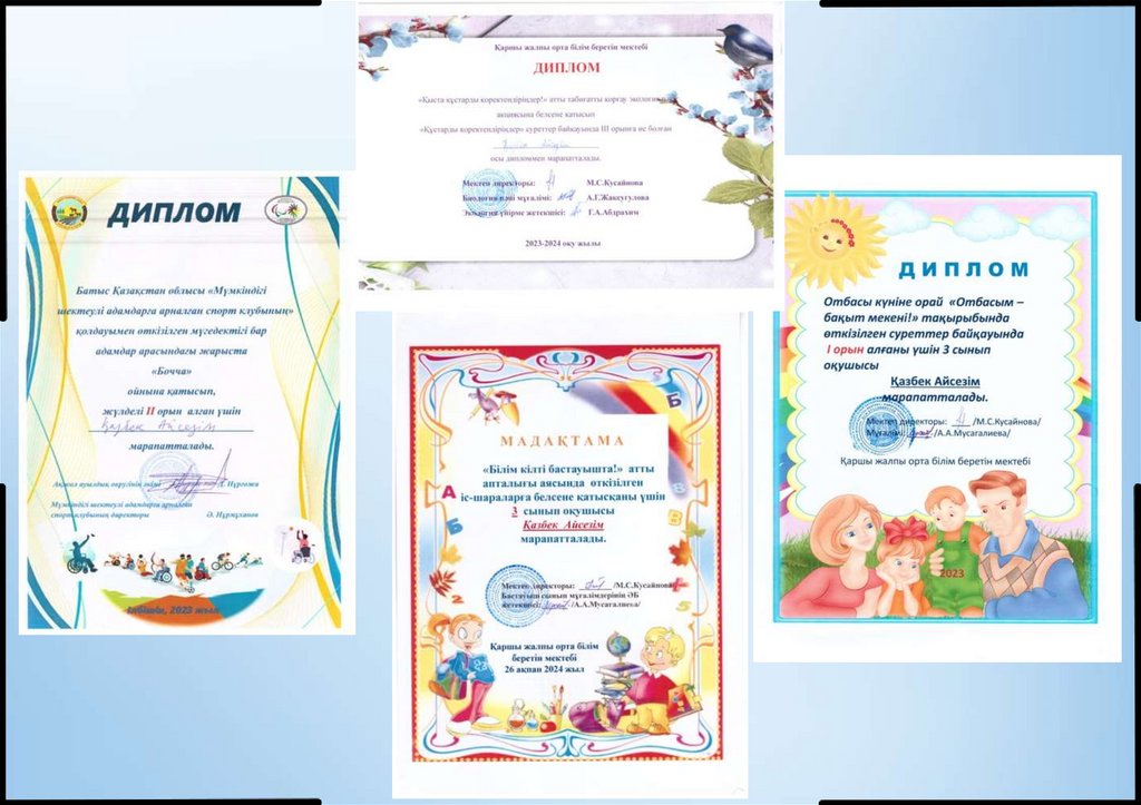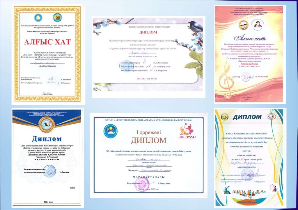 сүйіспеншілігі мен еңбексүйгіштігі үшін бірнеше алғыс хатпен марапатталған.