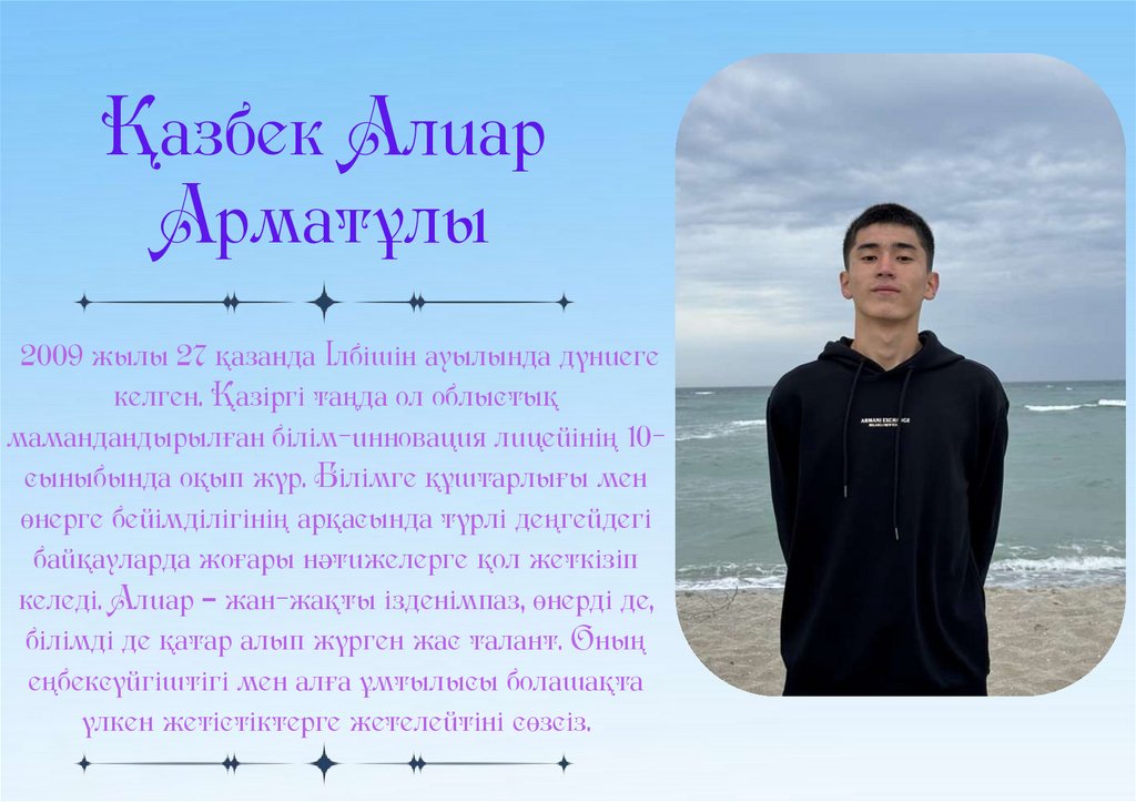мамандандырылған білім-инновация лицейінің 10сыныбында оқып жүр. Білімге құштарлығы мен