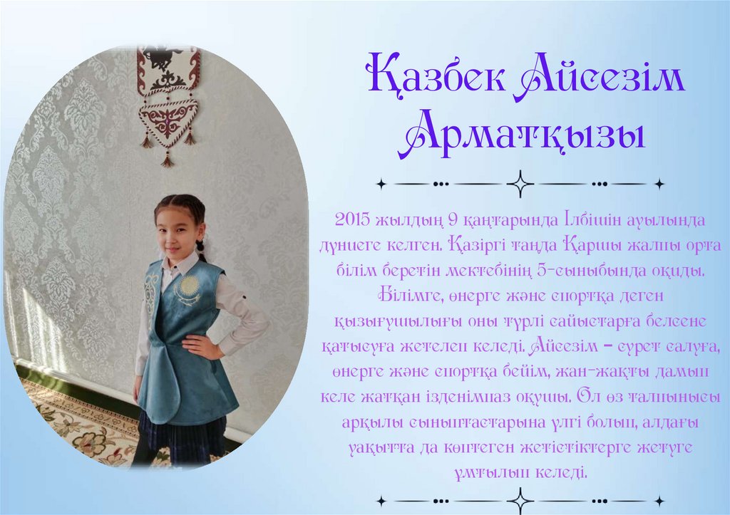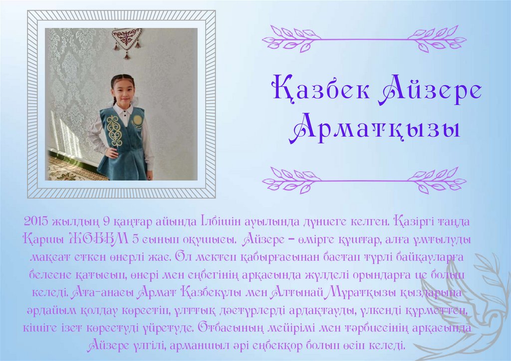 Қаршы ЖОББМ 5 сынып оқушысы. Айзере – өмірге құштар, алға ұмтылуды