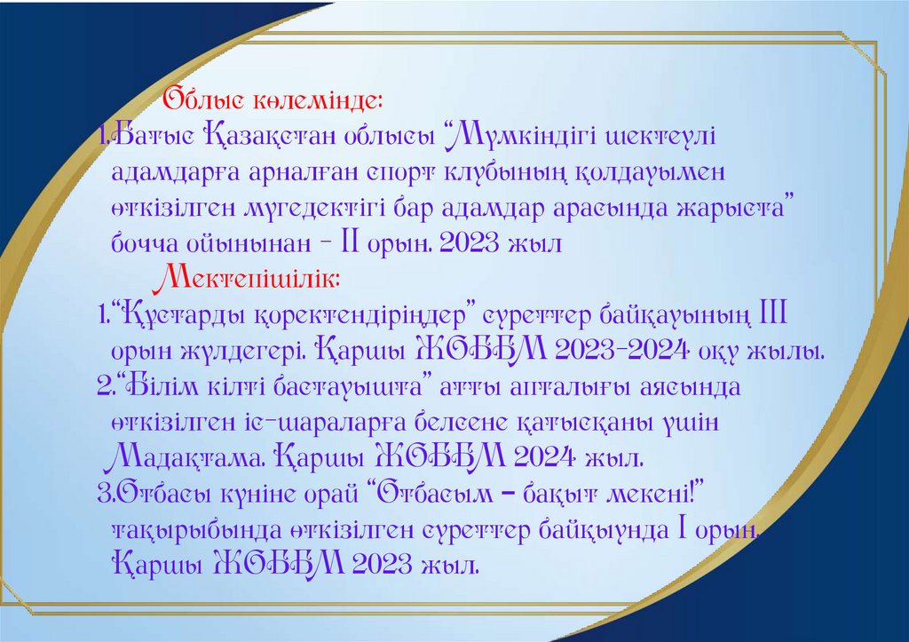 орын жүлдегері. Қаршы ЖОББМ 2023-2024 оқу жылы.